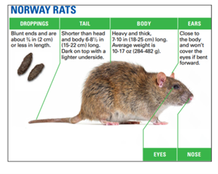 Norway rats are large and heavy-bodied, with small ears, a blunt nose, and a thick tail that is shorter than their body length. Their droppings are larger and capsule-shaped with blunt ends, commonly found along walls, near burrows, or close to ground-level food sources. Regularly inspecting foundations and improving sanitation around ground-level feed and waste areas can reduce the conditions that attract these rodents.