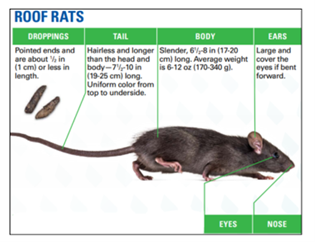 Roof rats have slender bodies, pointed noses, large ears, and long tails that are longer than their head and body combined, which helps distinguish them from Norway rats. Their droppings are banana-shaped with pointed ends, often found along rafters, ledges, and elevated runways. Trimming nearby vegetation and securing roof and vent openings can help prevent roof rats from gaining access.